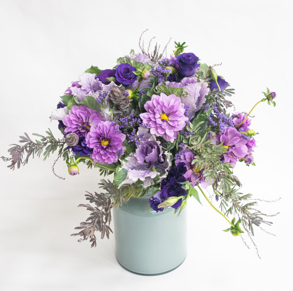 בוקה פרחים נמוך השזור מפרחי ליזיאנטוס, כרוב , דליה וענפי ירק מגוונים.