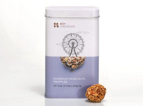 טראפלס של קרם ג’אנדויה נימוח בציפוי שוקולד חלב וקראנץ אגוזי לוז במארז פח מהודר